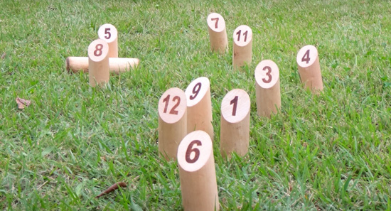 点数の書いてある木製の棒に向かって、モルック(棒)を投げて、